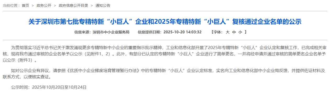 Recently, the Shenzhen Small and Medium-sized Enterprise Service Bureau announced the list of the seventh batch of national-level “Little Giant” specialized and innovative enterprises, as well as the list of enterprises that passed the 2025 review.